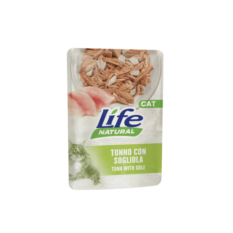 Trancetti di tonno di prima scelta con aggiunta di sogliola, cotti al vapore e conservati in gelatina vegetale. Senza coloranti, conservanti o additivi. E’ un alimento ricco di proteine nobili e povero di carboidrati, nel rispetto delle esigenze nutrizionali del gatto. L’aggiunta di sogliola rende il prodotto più leggero e digeribile. Fatto con alte percentuali di pesce, è preparato selezionando solo le parti migliori, ovvero le stesse che mangeremo noi.