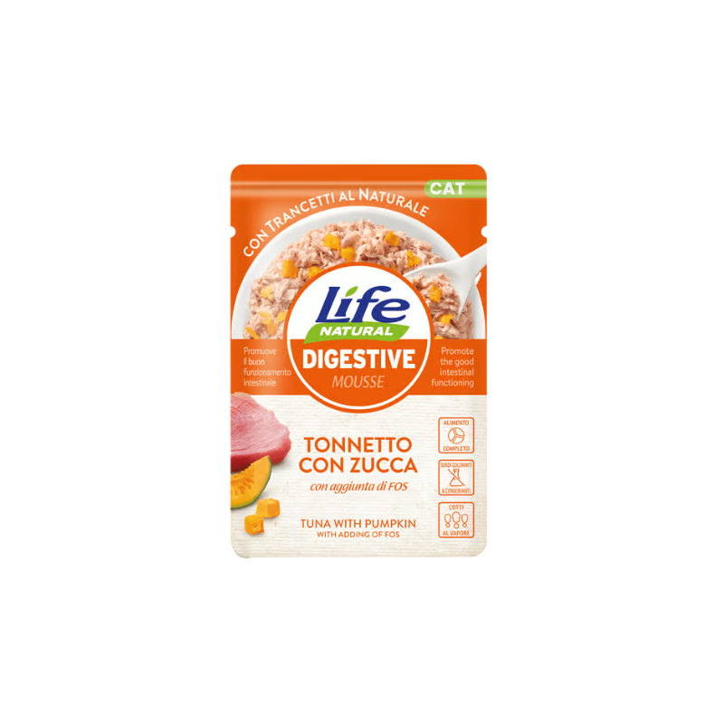 Life Natural Digestive Mousse è un alimento completo per gatti adulti, fatto con trancetti di tonnetto al naturale e un’aggiunta di zucca, importante fonte di fibre. Grazie all’integrazione di FOS, che svolgono funzione prebiotica, si promuove il buon funzionamento intesinale e l’equilibrio digestivo del gatto.