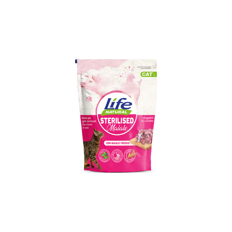 Il gatto è un carnivoro e, come tale, necessita di una dieta ricca di proteine animali. I gatti sterilizzati e con minore attività fisica possono richiedere, in aggiunta, un’alimentazione con un ridotto contenuto di magnesio ed un apporto di fibre adeguato alla gestione del peso. La formula STERILISED MAIALE, grazie anche a preziose integrazioni funzionali, come L-Carnitina e Selenio in forma organica, è un alimento ideale per i gatti sterilizzati, ed in genere, quelli sedentari.