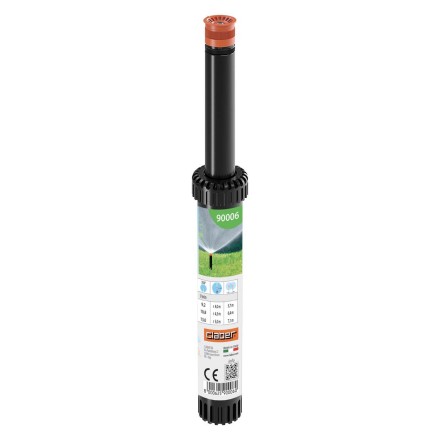 Irrigatore statico professionale con testina regolabile da 0° a 350°. L’ugello con profilo di speciale disegno consente una precipitazione dell’acqua uniforme e bilanciata. Vite di regolazione della gittata in acciaio inox. L’attacco standard da 1/2” (15 - 21 mm) F permette il montaggio come ricambio anche su impianti esistenti. Escursione dal terreno di 4” (cm 10). Area massima irrigabile 78 m².