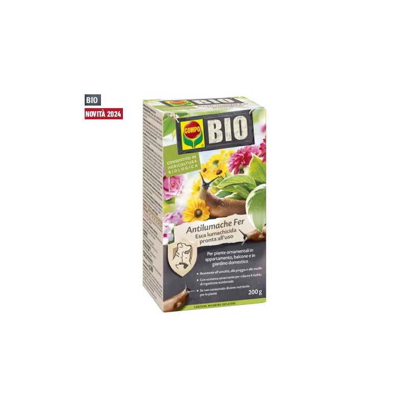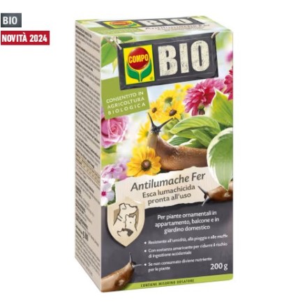 Antilumache Fer è un'esca lumachicida contenente una sostanza attiva moderna a cui si associa la tecnologia messa a punto dalla ricerca COMPO. I granuli sono a base di fosfato ferrico naturalmente presente nel suolo, che una volta degradato dai microrganismi diventa nutrimento per le piante. Antilumache Fer è pienamente compatibile con tutte le specie e varietà di floreali e ornamentali.
